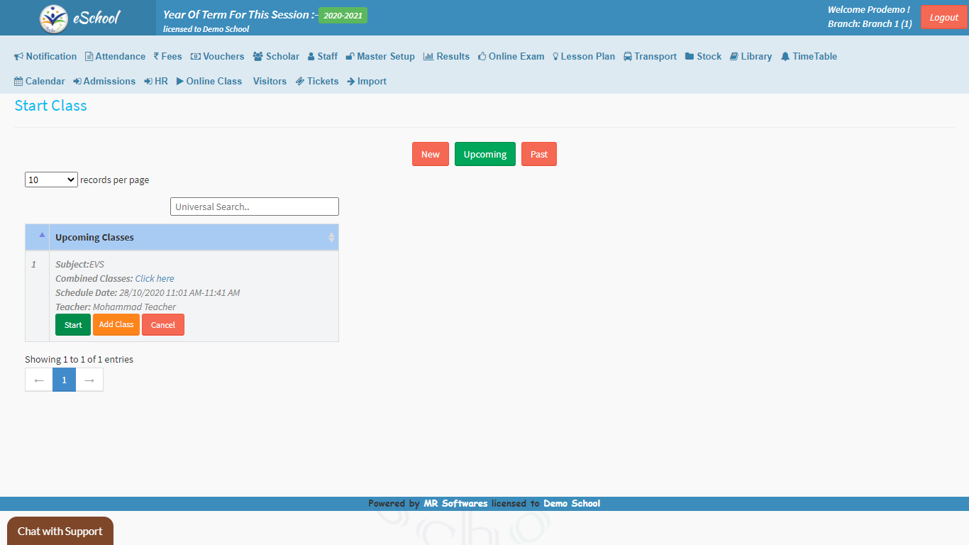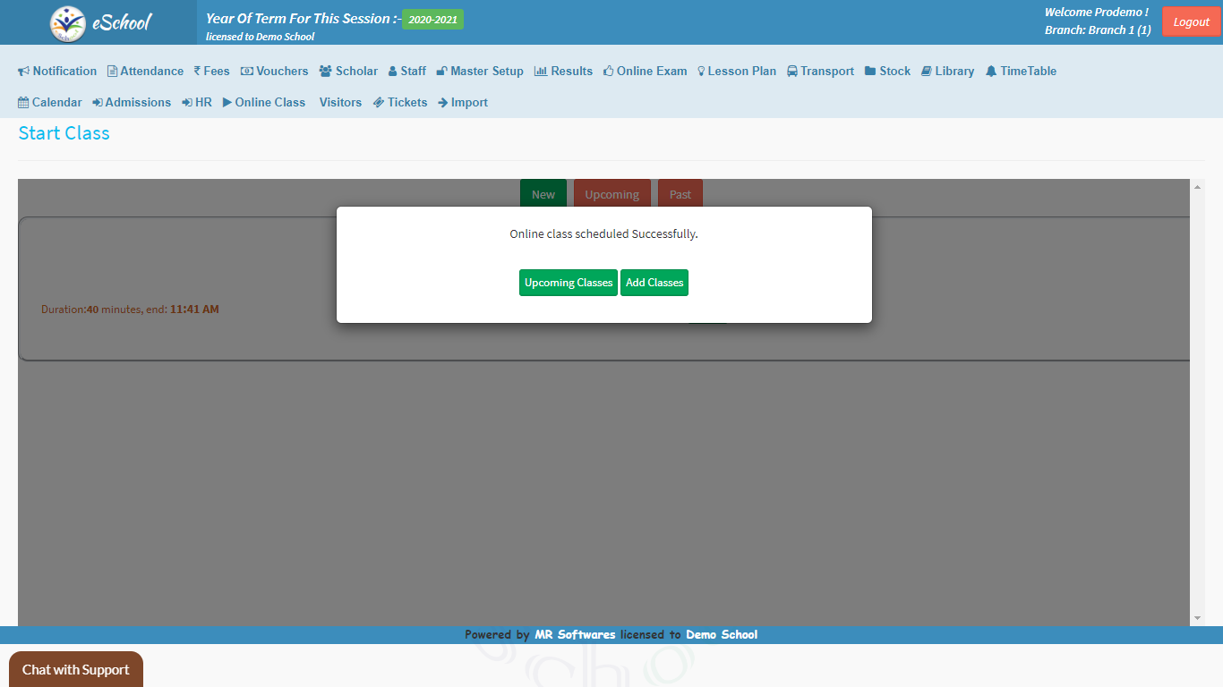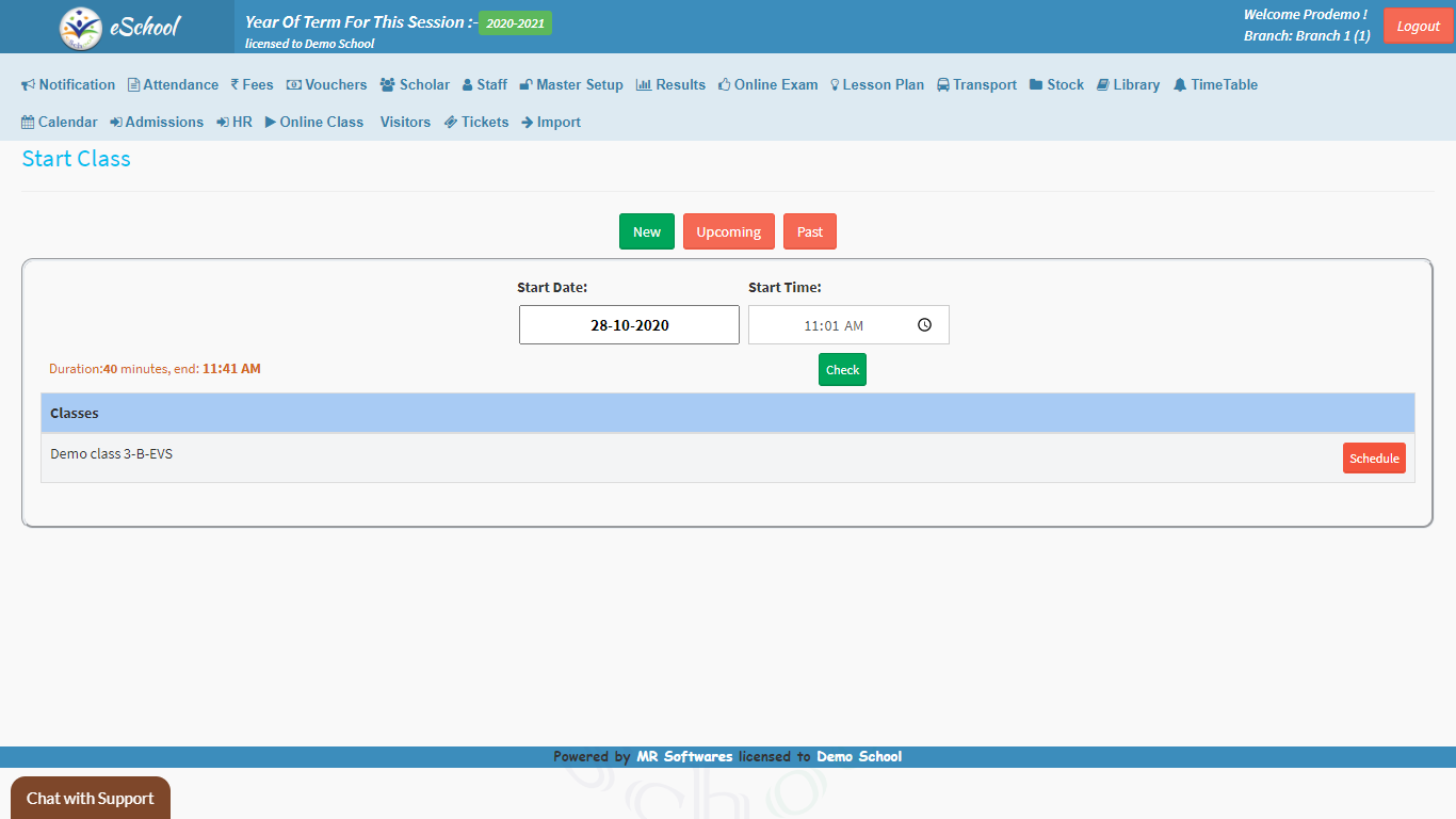 • Import Schedule: You can import the schedule for the online classes well in advance to keep yourself and the staff well ahead and prepared. We can schedule training for your teachers accordingly to ensure that your team is well-trained.Start Class: This feature is the ‘Power On’ button of the module, all the scheduled classes can be started here at the scheduled time. Every Class is scheduled for 40 mins by default.