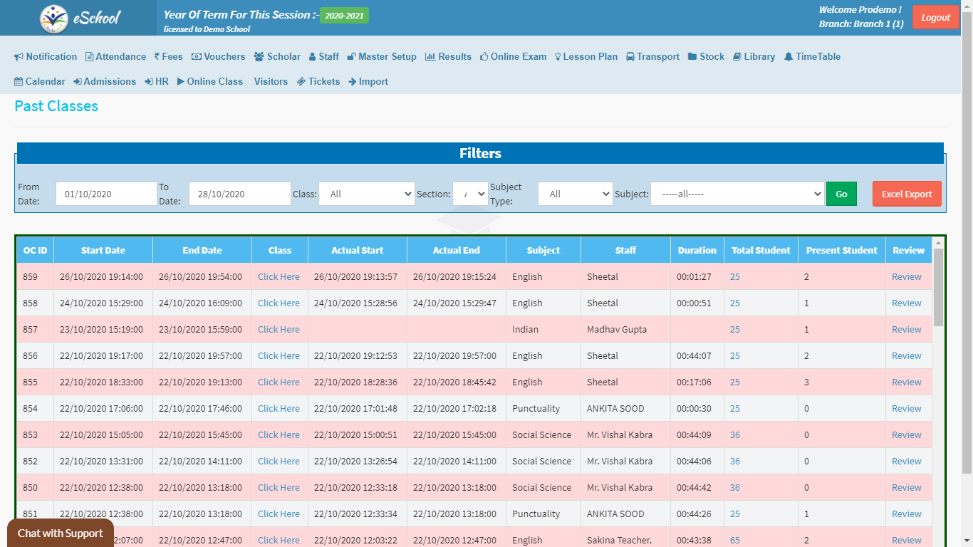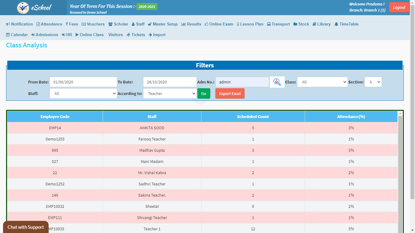 • Class Analysis: This is a comprehensive module that gives you all the information that you need to understand what teachers are doing, how many students are joining the class. This gives a comprehensive view of the attendance of online classes by the students, by class, and also for any individual.
