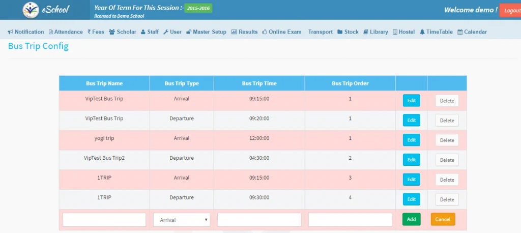 *NOTE :- The Bus Trips which you make here, will be shown in almost every part of Transport Module and also plays a very important part while taking out various Reports. So make these entries carefully.
