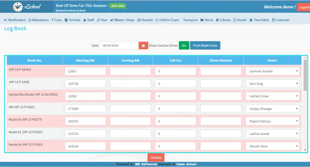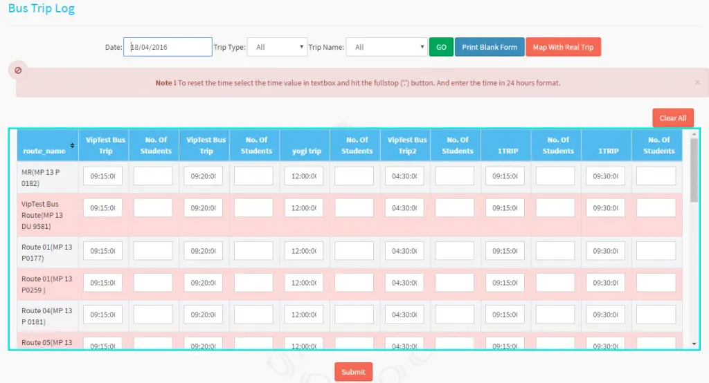 Bus Trip Log :- Just like Fuel and KM reading, you can do the entries for all the trips which a particular bus is making in the school. You can mention the time details, no. of students of either the arrival or departure trip of all the buses and all the trips (whichever you have made).