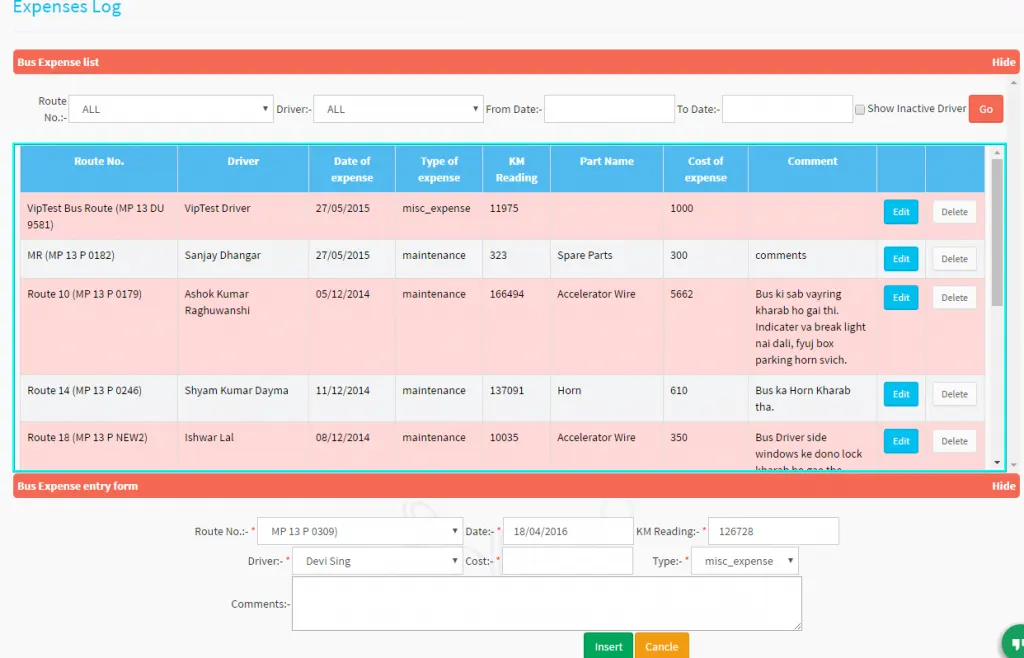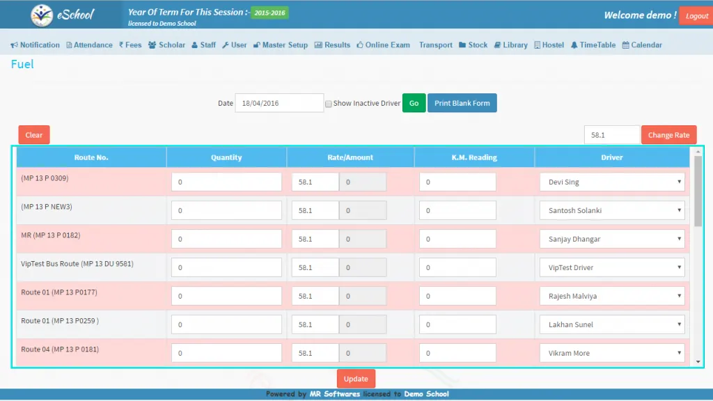 Fuel :- The buses of the school have to make many trips daily to take the students to and fro from the school to their respective stops. For this the buses should have ample amount of Fuel in their tanks to complete the trips without making any delays. This segment allows you to keep record of the fuel activities of all the buses in the school.