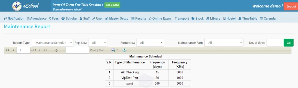 Maintenance Report :- In this the information related to maintenance can be taken out and the maintenance of the vehicles in your school can be managed. This report will give you information of maintenance schedule and pending maintenance.