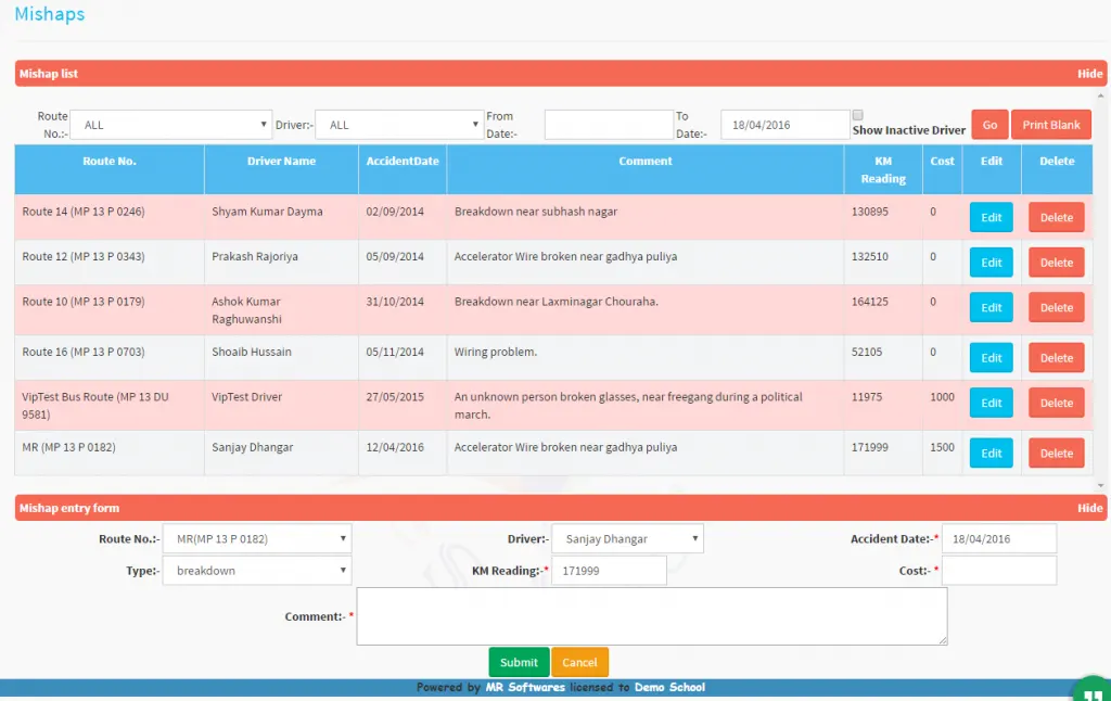 Mishaps :- When the buses and various different vehicles are moving and doing transportation in daily basis then it is very likely that the bus can meet with any type of Mishaps on the way. eSchool ERP has a feature to enter all the mishaps which takes place with the bus.