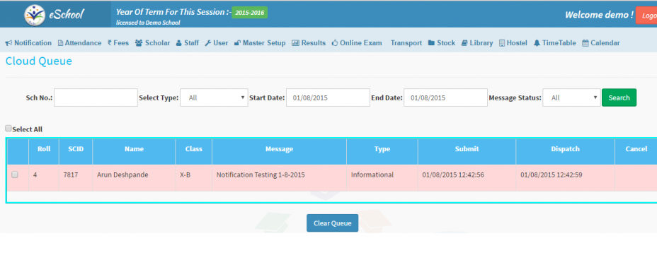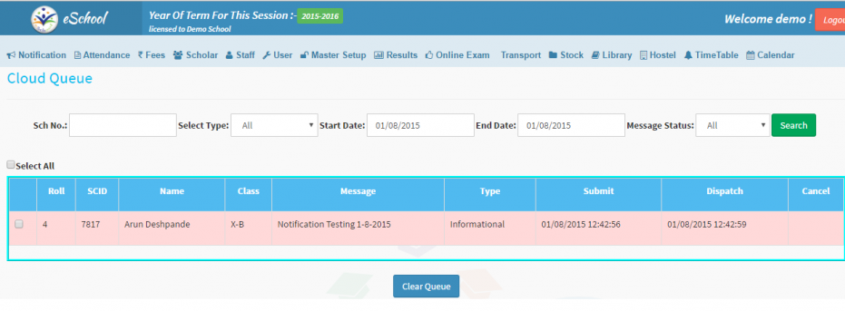 • Sent SMS Report :- Just like Cloud Queue is for keeping track of app notification, in sent SMS Report user can keep track of the SMS’s sent from the system. User can see the report for a particular date range of a particular scholar according to their choice. Or they can search by using status filter.