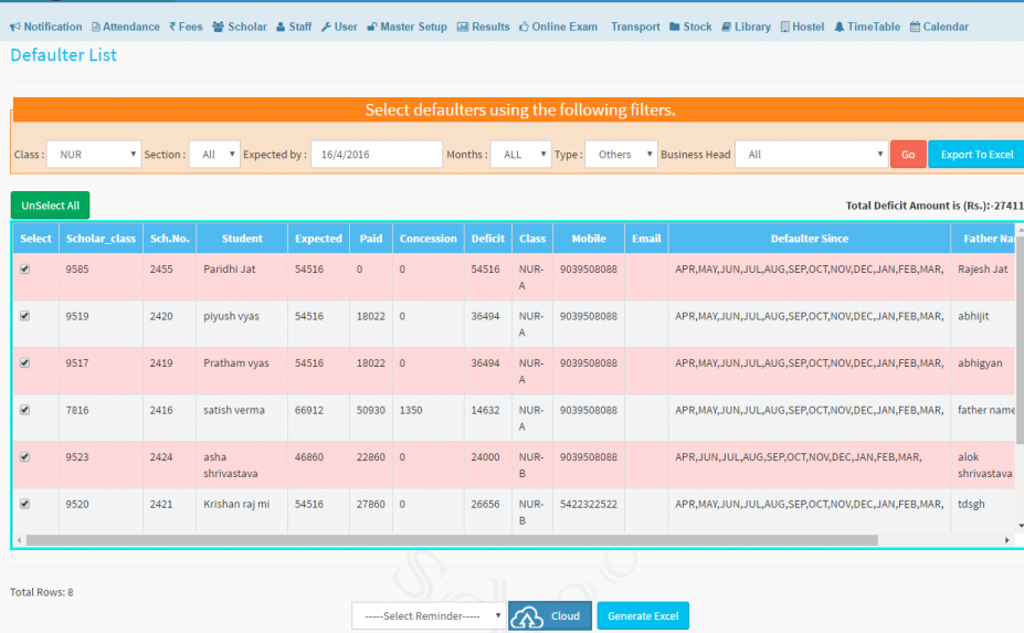 Defaulter list is very useful in keeping track of the students whose fees is not submitted and also to see what is the Total Deficit Amount which is due for school.