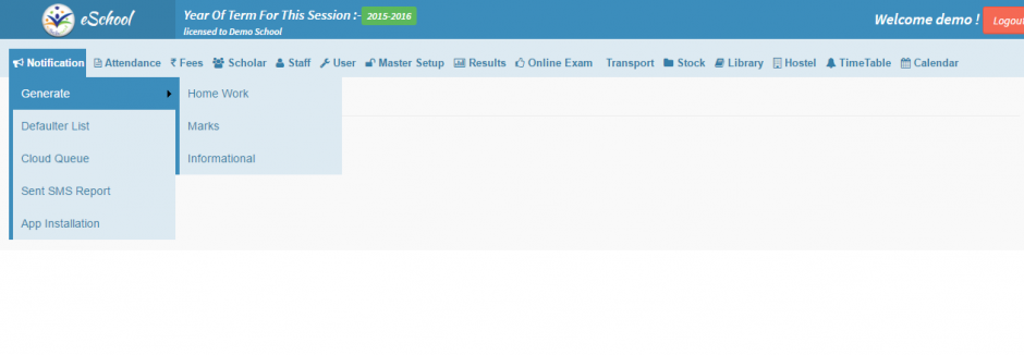 Que:-  How we generate notification related to homework, marks or other information?Ans:- Go notification, then generate, then for homework choose homework,for marks choose marks, and for other information choose informational, the form will be open which will be you choose now fill the field according to your requirement, and send notification by click on cloud button.