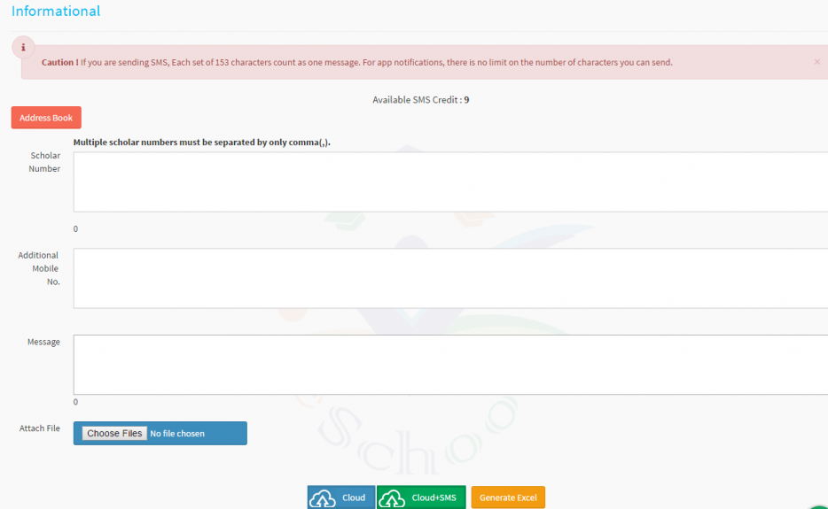 There are 3 types of notification which can be generated from here i.e. Homework , Marks and Informational.
