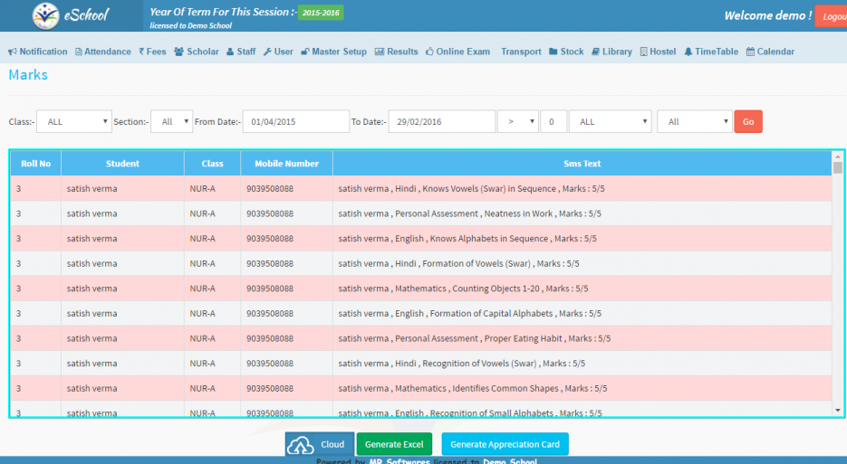 • Marks :- To send the notification of marks of a particular exam, the user can use this segment. Just select the class, the date range or the marks order. Then click on cloud so that the Notification will be sent. User can also generate excel file for marks by clicking on generate excel.