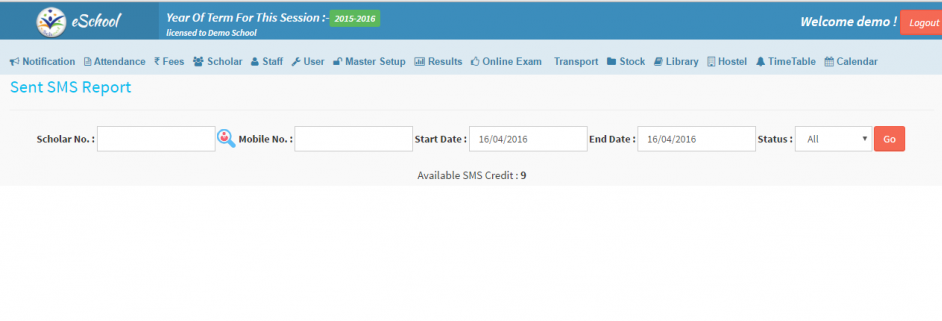 • Reports :- In this segment user can check how many SMS are sent by school, its search by range of date.