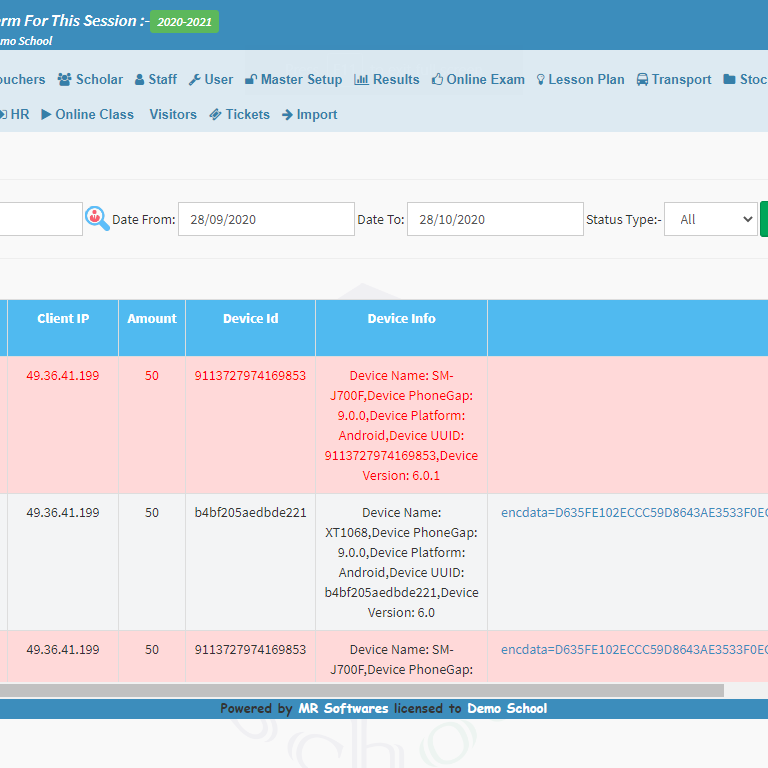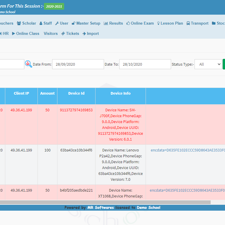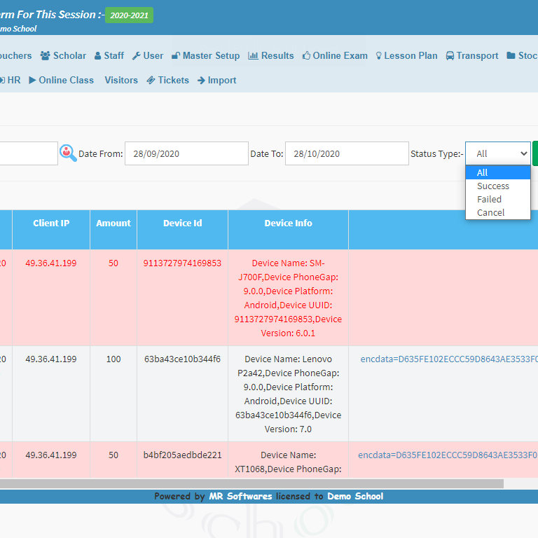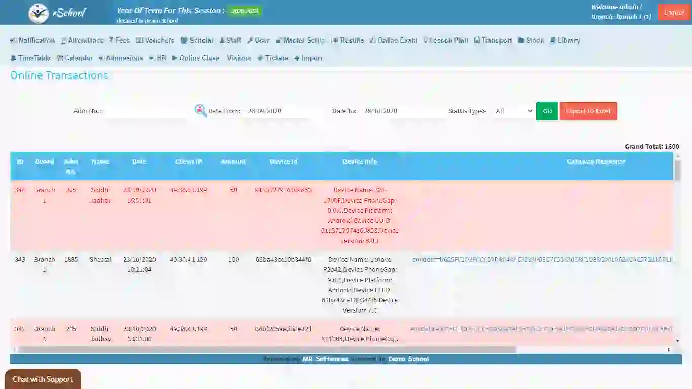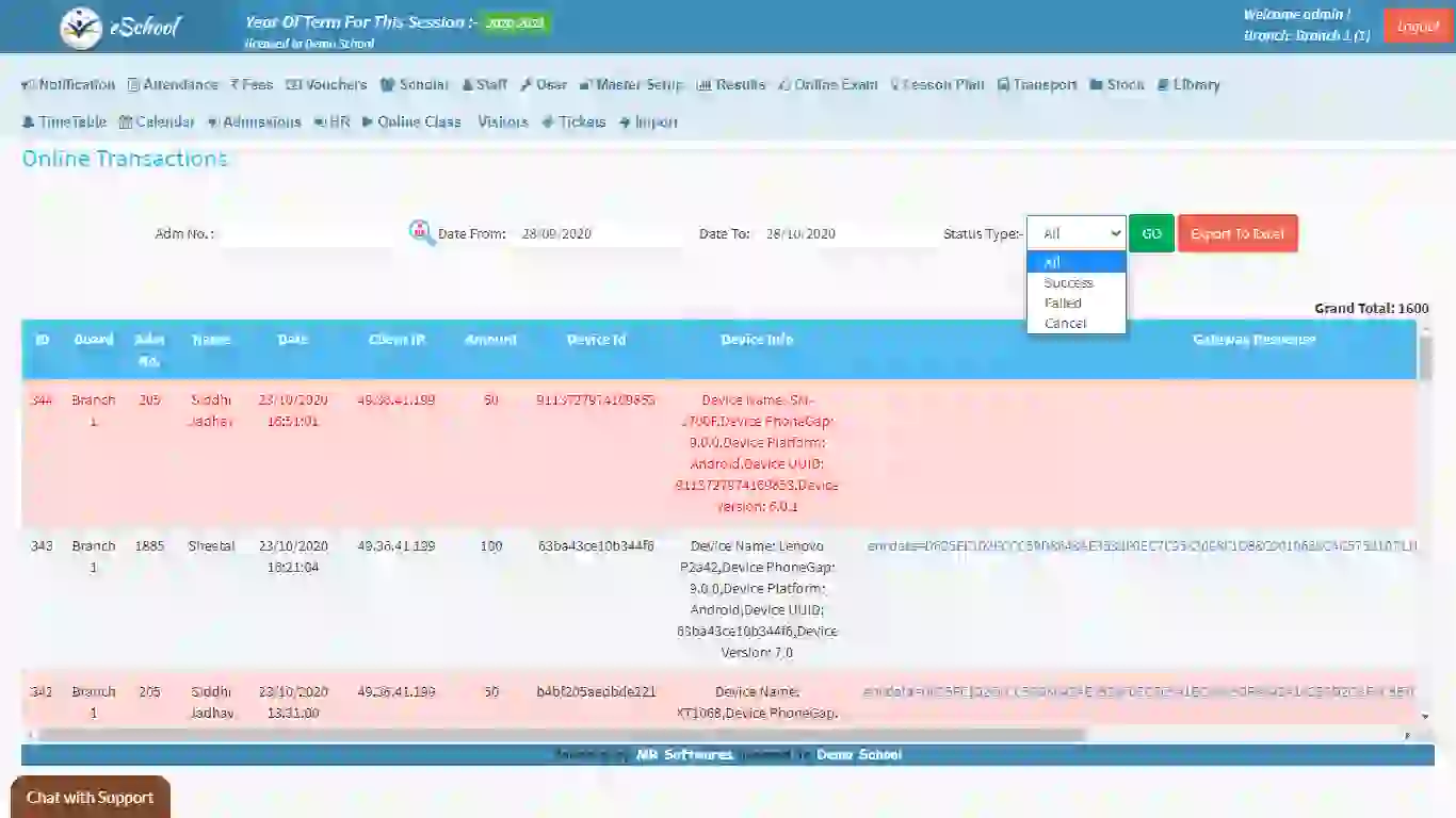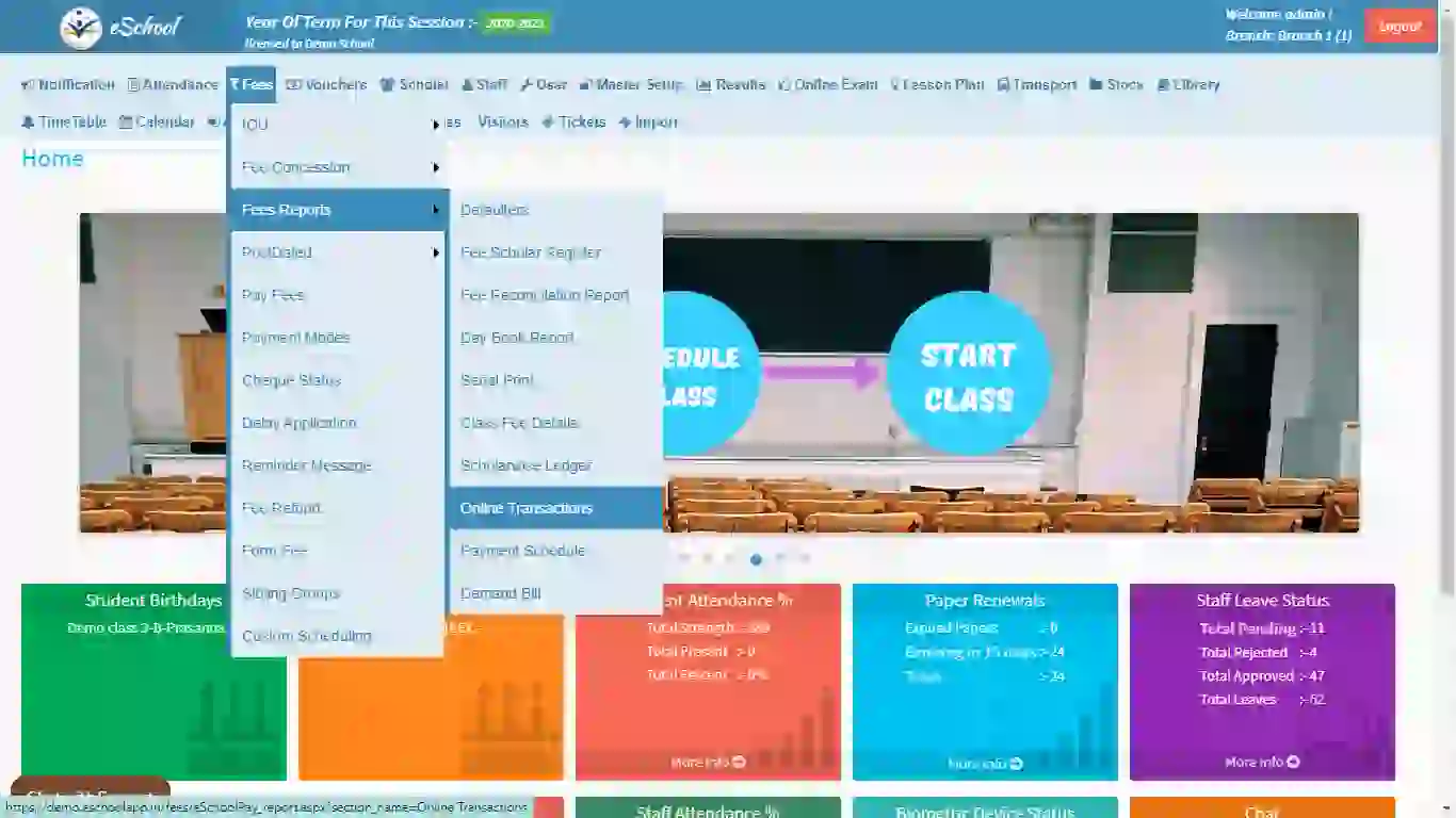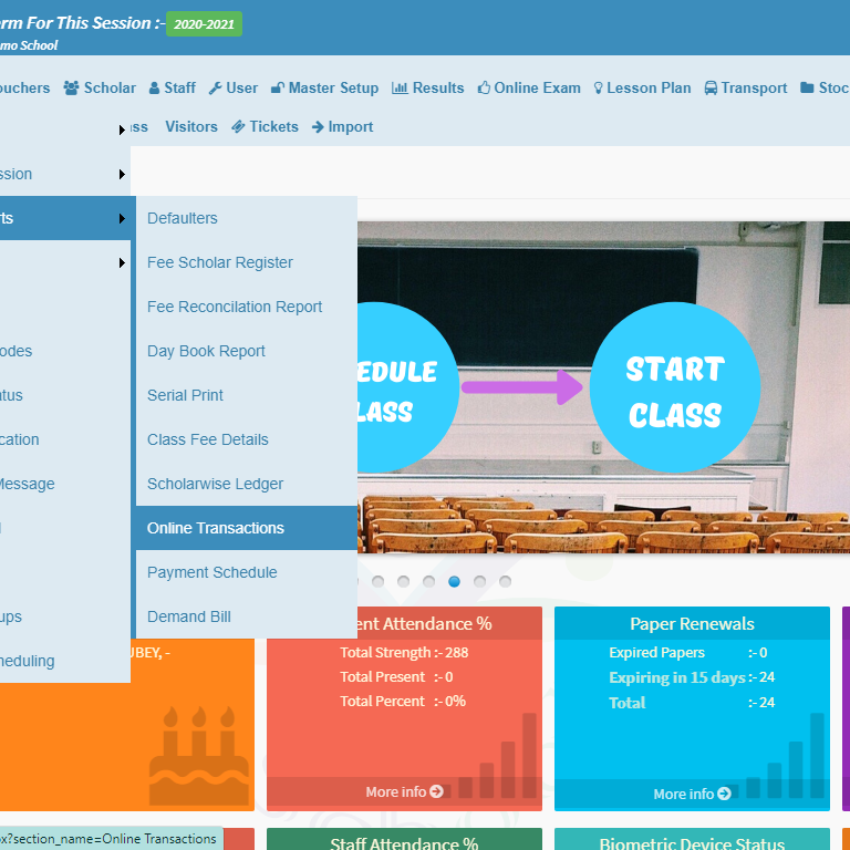 • Online transactions:  A collection of all the online payment received by the school towards fee or admission charges.